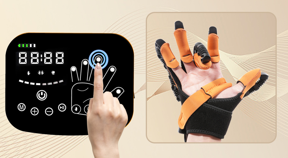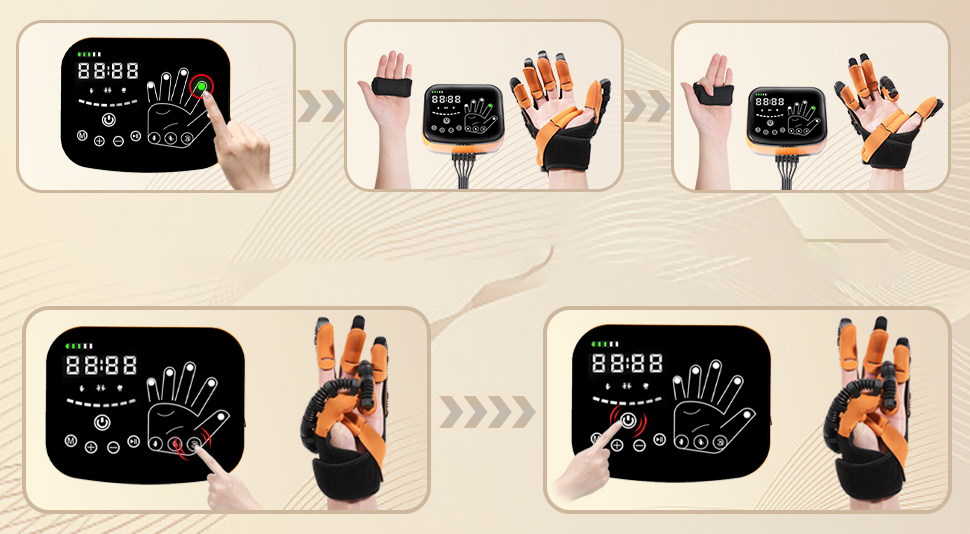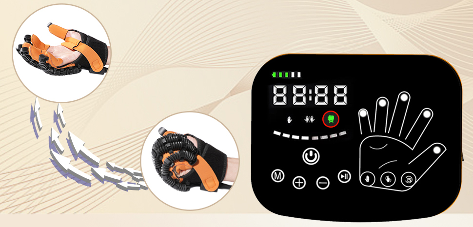 Antrenament complex al degetelor: Mănușa oferă exerciții de rotație pentru cele cinci degete, antrenament secvențial de tragere, reducerea tensiunii musculare și funcție de antrenament în oglindă, pentru coordonarea mișcărilor ambelor mâini.