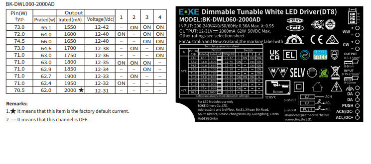 BOKE BK-DWL060-2000AD este un controler LED profesional, proiectat special pentru a gestiona module LED cu lumină albă reglabilă (Tunable White). Dispozitivul suportă standardul DALI-2 DT8 și modurile de control PUSH-DIM / PUSH-CCT, fiind astfel o alegere ideală pentru sisteme moderne de iluminat – birouri, clădiri publice, spații comerciale și soluții de iluminat inteligent pentru locuințe.