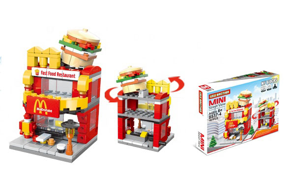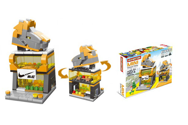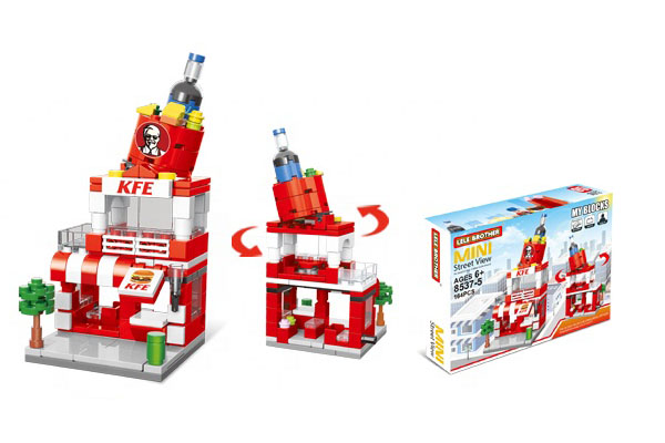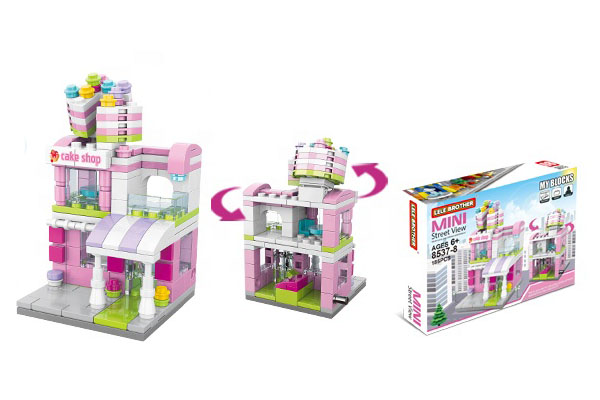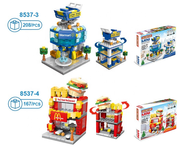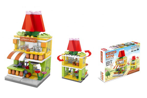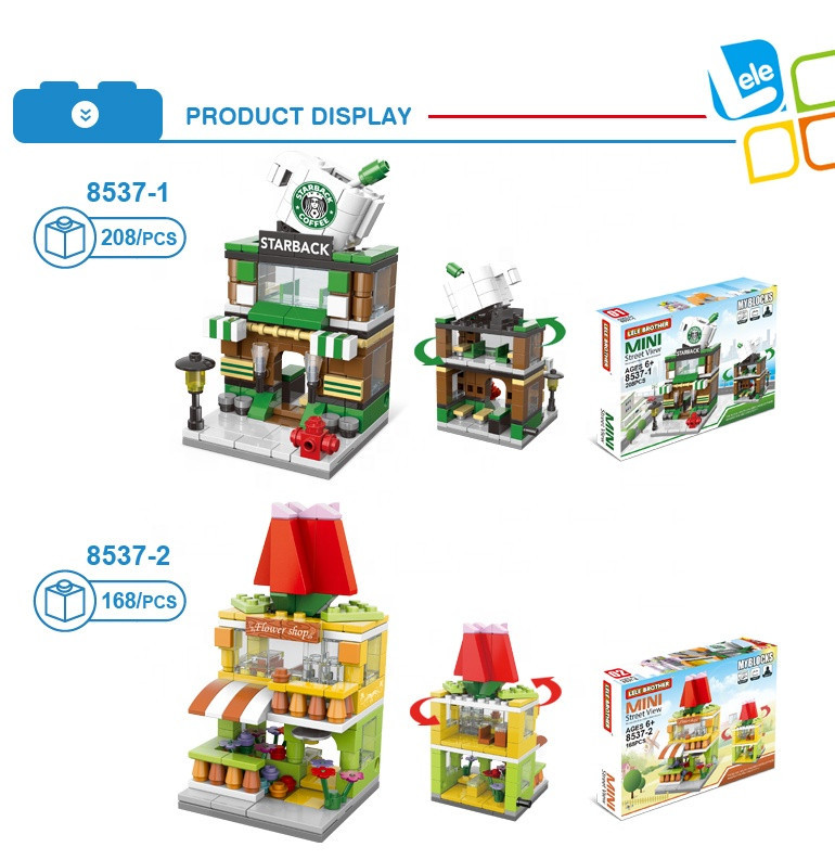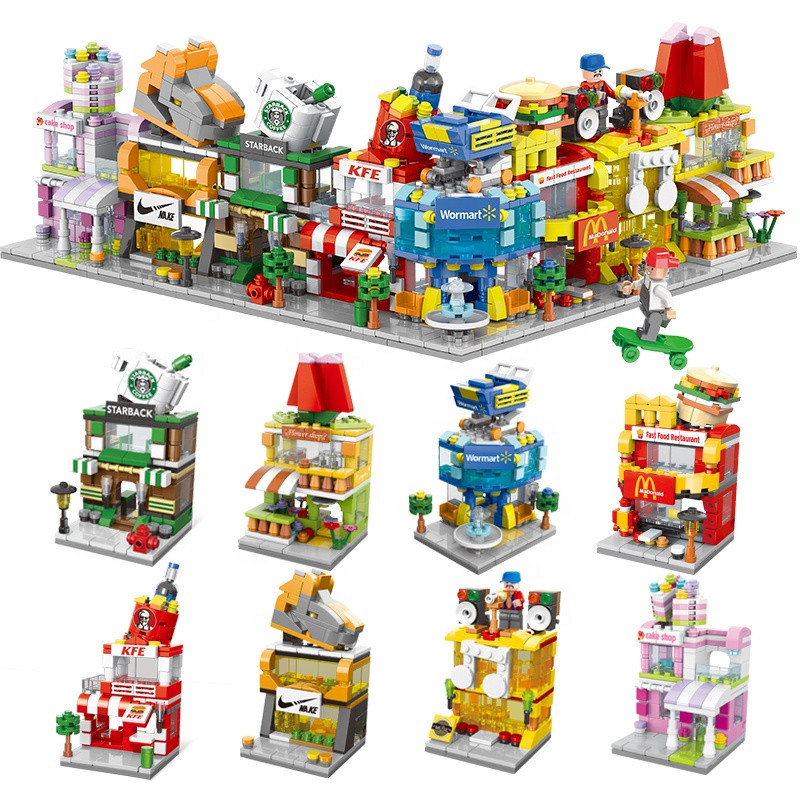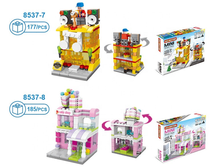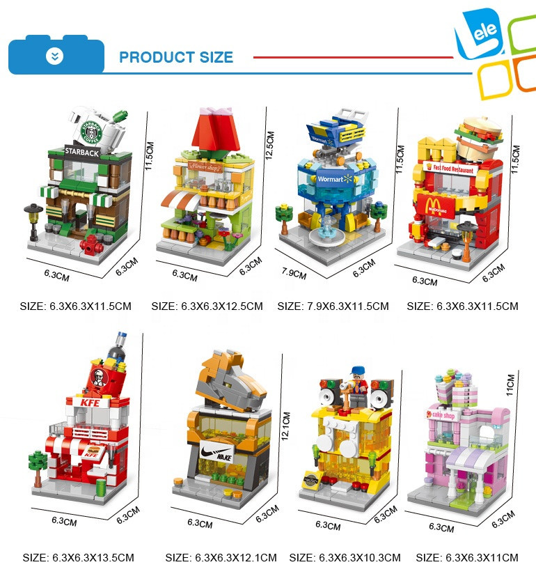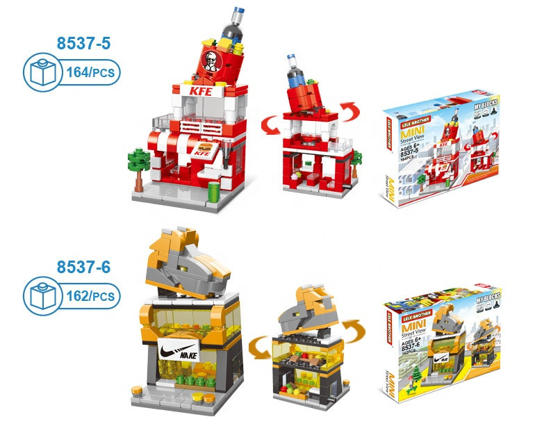 Setul include 8 clădiri care pot fi achiziționate separat, fiecare putând fi construită individual, dar care, puse împreună, formează o stradă comercială completă.