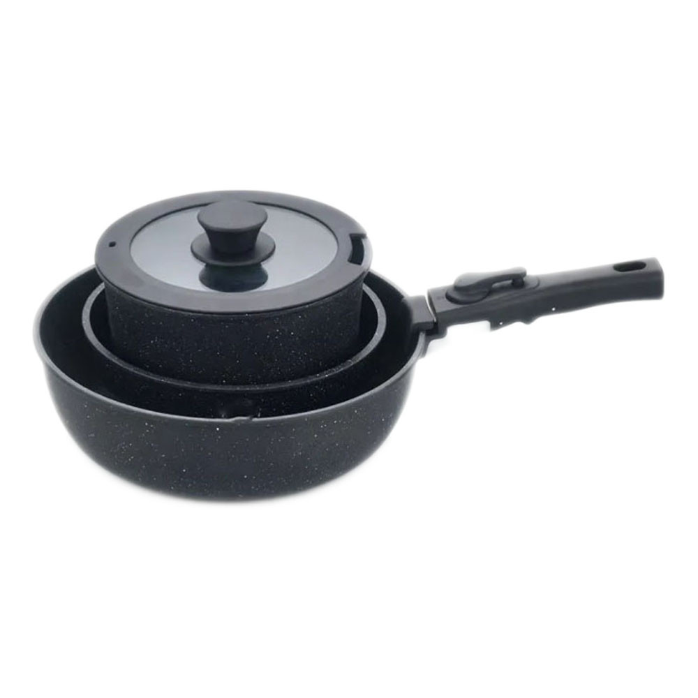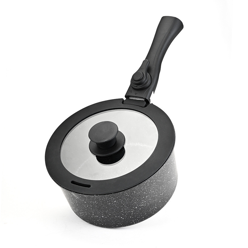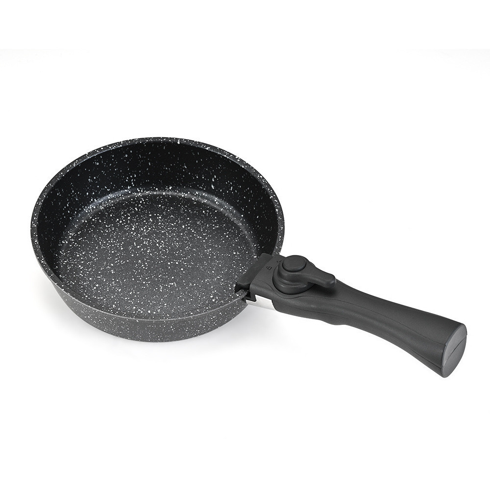 Mânerul detașabil se atașează sau se îndepărtează printr-o singură mișcare, astfel încât aceeași oală poate fi folosită atât pentru gătit, cât și pentru servire. O alegere ideală pentru gătitul acasă, camping sau picnic – ocupă un spațiu minim, dar oferă echipament de bucătărie complet.