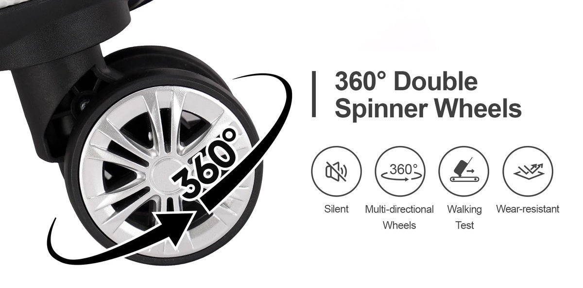 Trollerele sunt echipate cu roți duble tip spinner, care se rotesc 360°, oferind o mișcare lină și ușor controlabilă chiar și în locurile aglomerate. Funcționarea silențioasă, capacitatea de rulare multidirecțională, rezistența la uzură și durabilitatea testată garantează că trollerul va fi un companion de încredere pe termen lung.